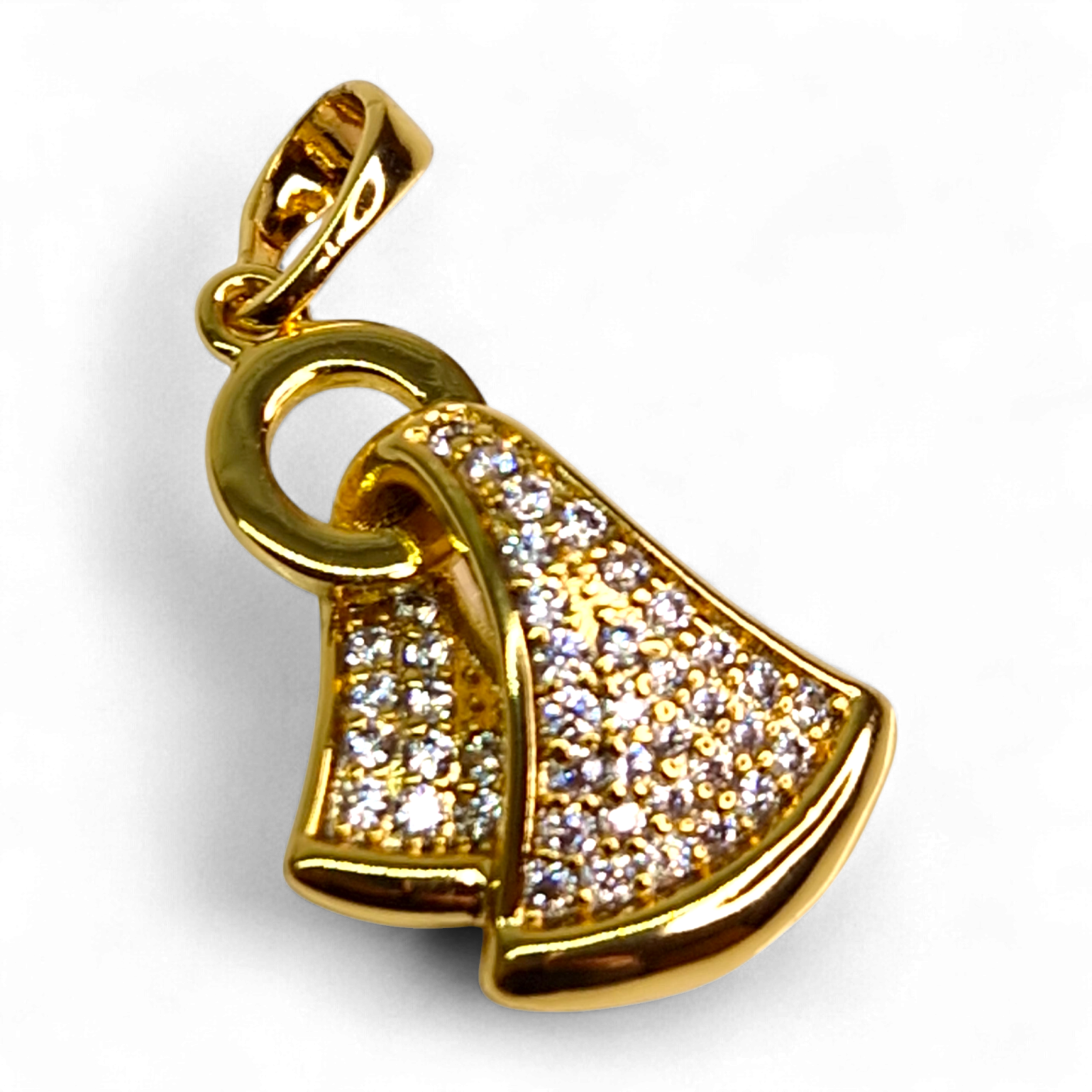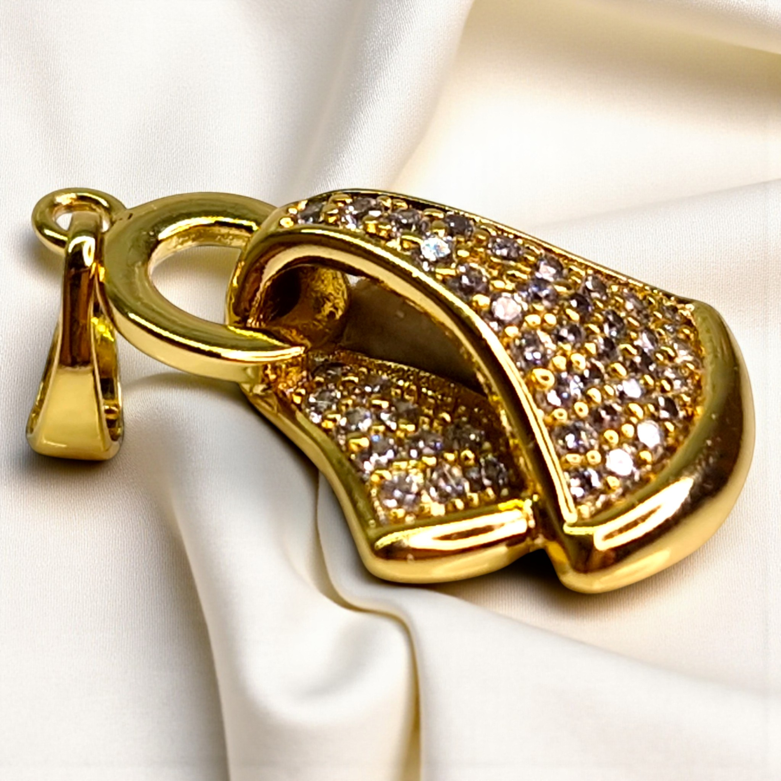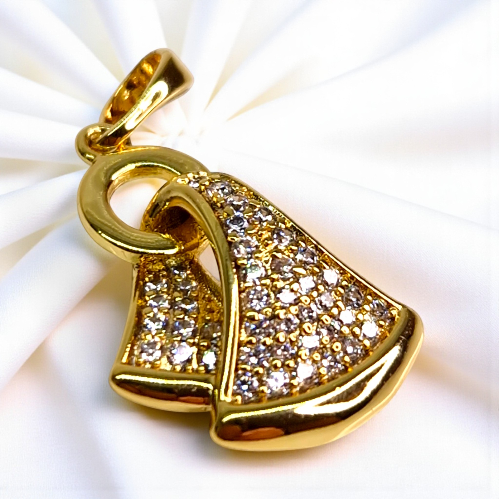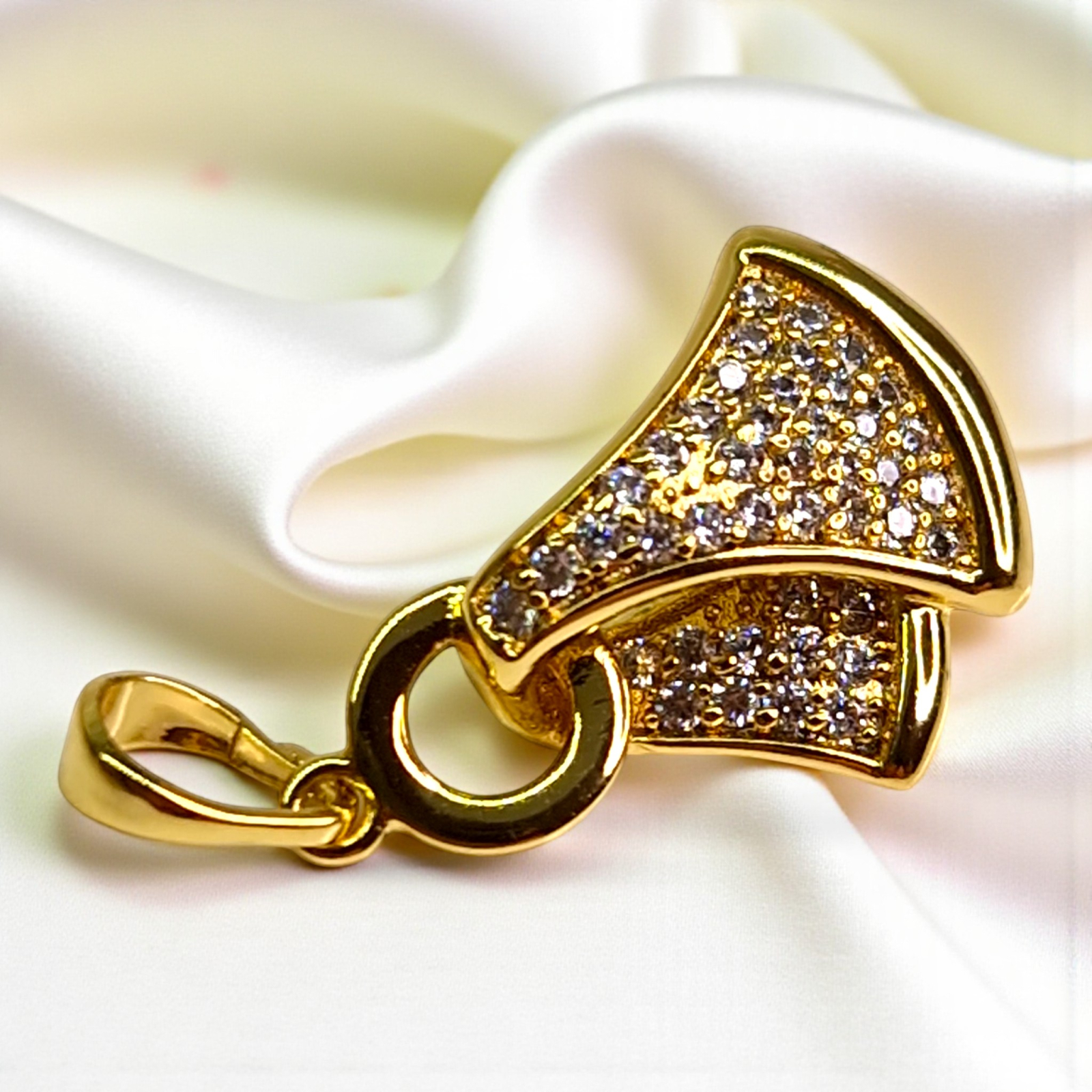 Pandantivul are o formă elegantă, ușor curbată, ce imită unduirea unui material luxos.