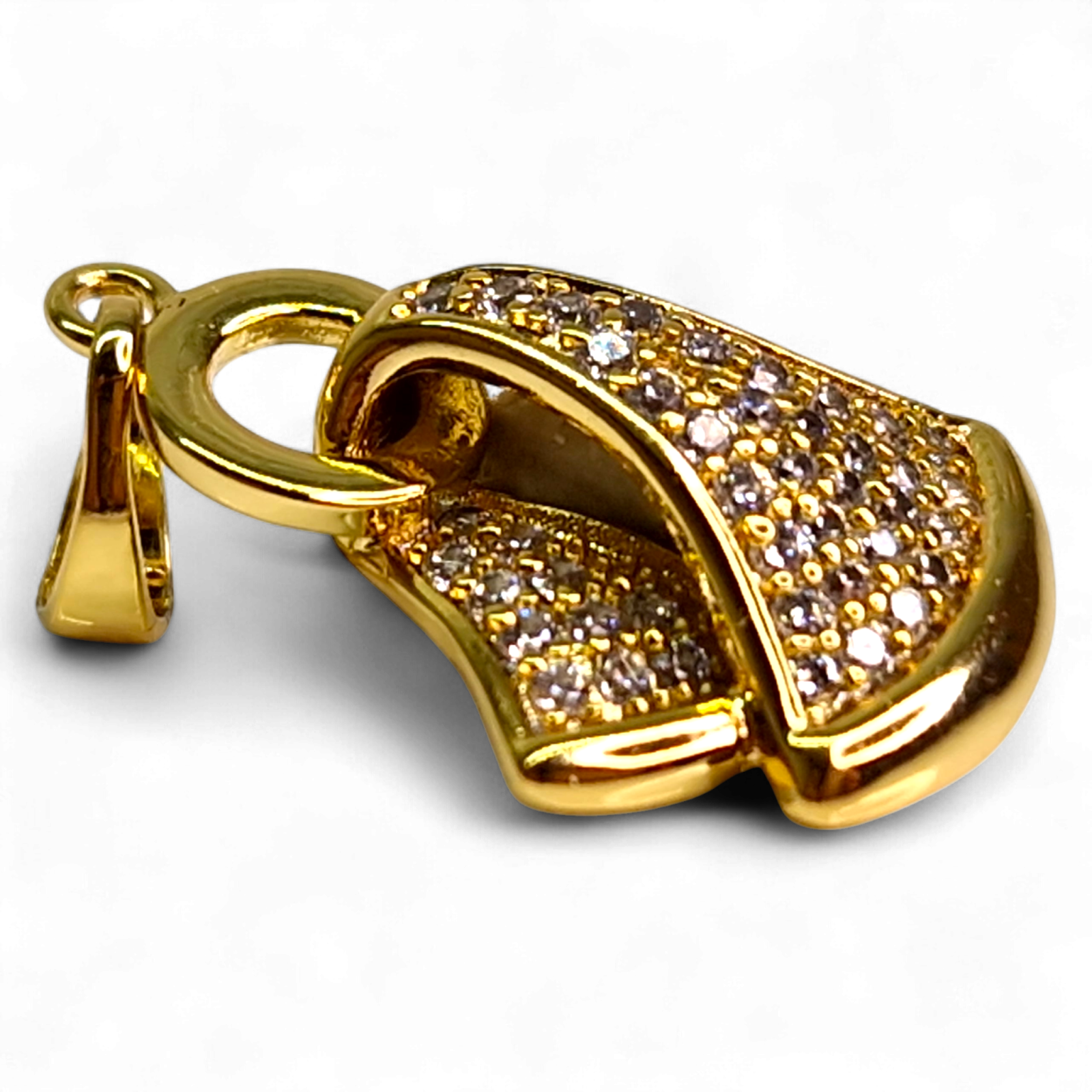 Realizat din oțel inoxidabil placat cu aur, pandantivul oferă: