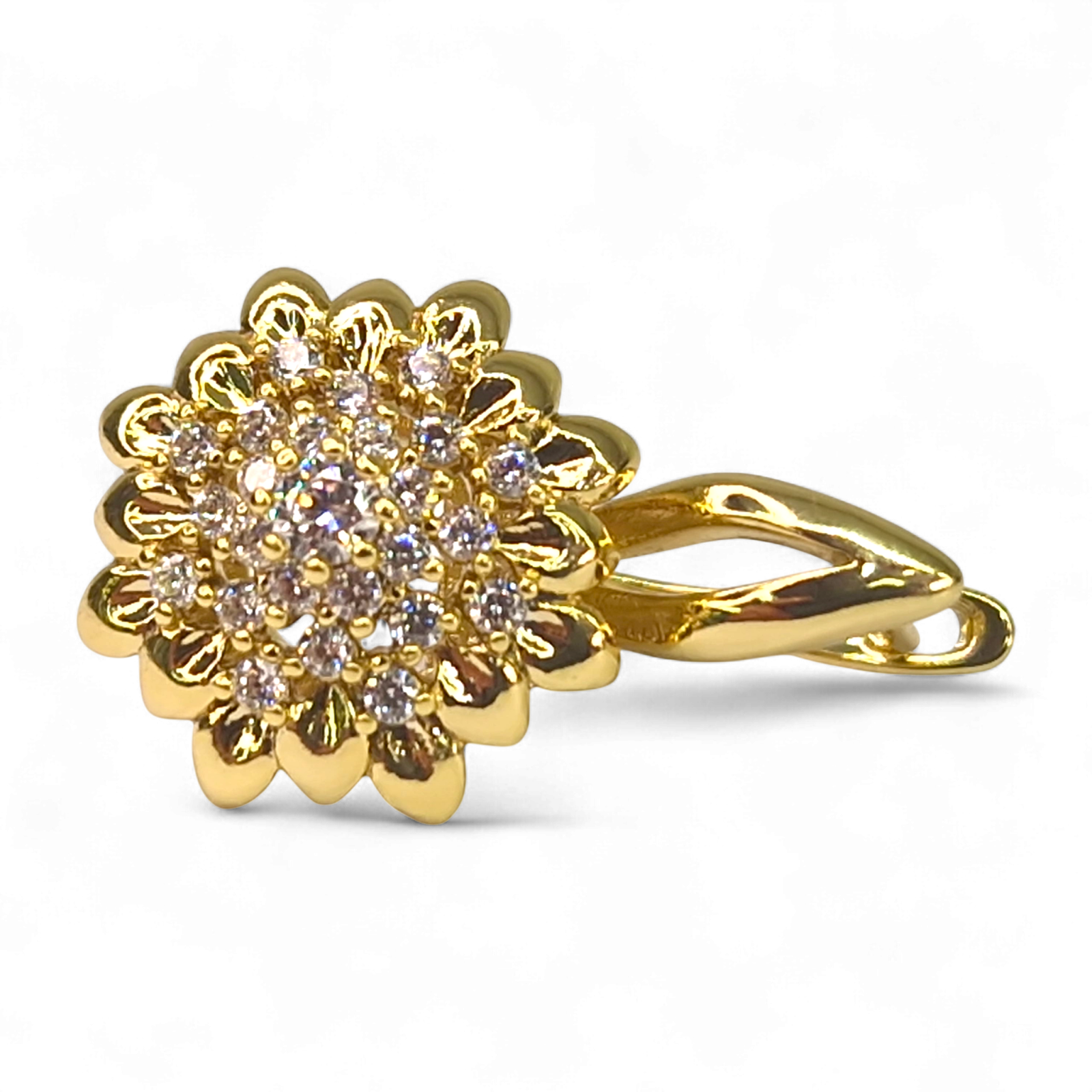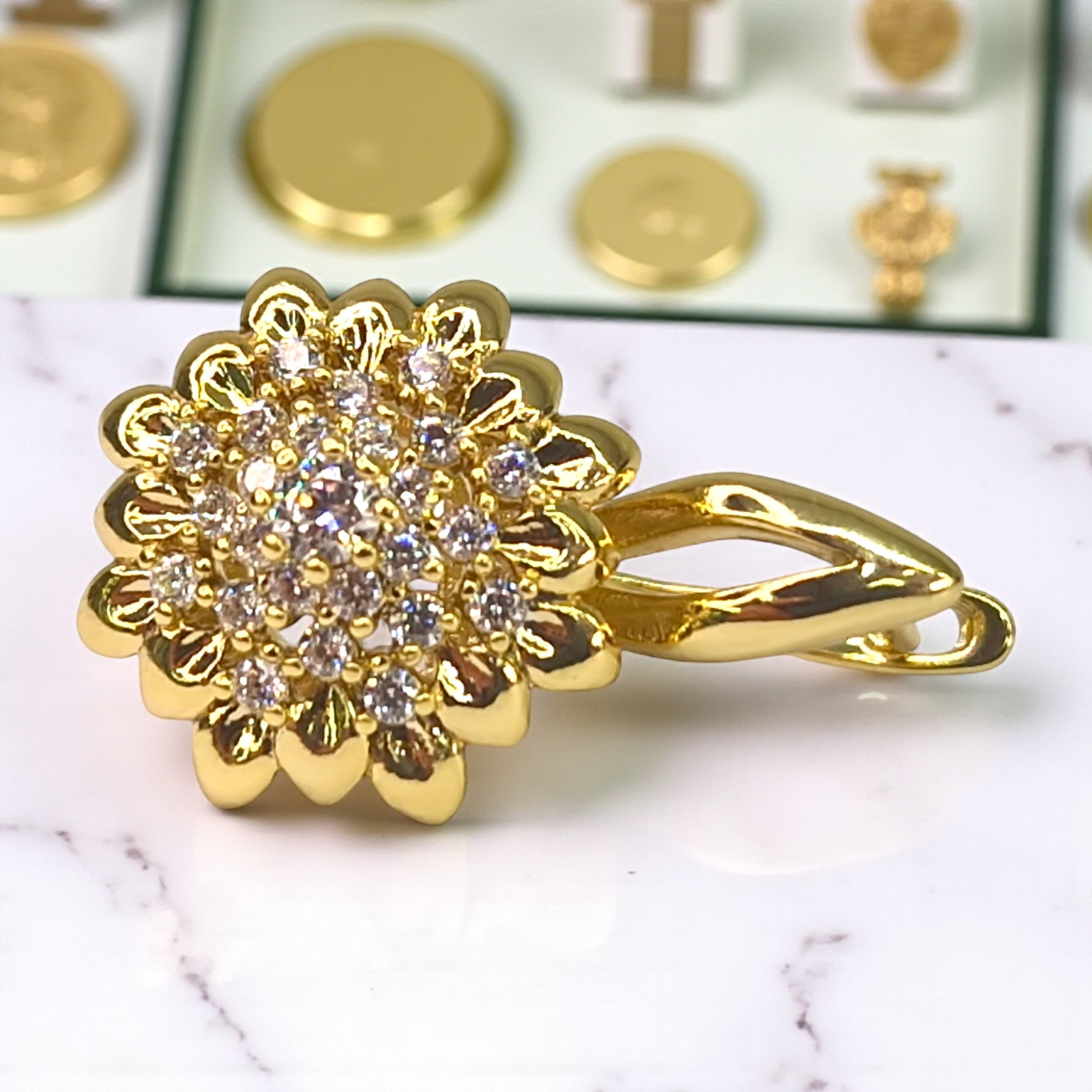 Contrastul dintre petalele aurii lucioase și centrul plin de lumină transformă modelul într-o piesă subtilă, dar spectaculoasă.