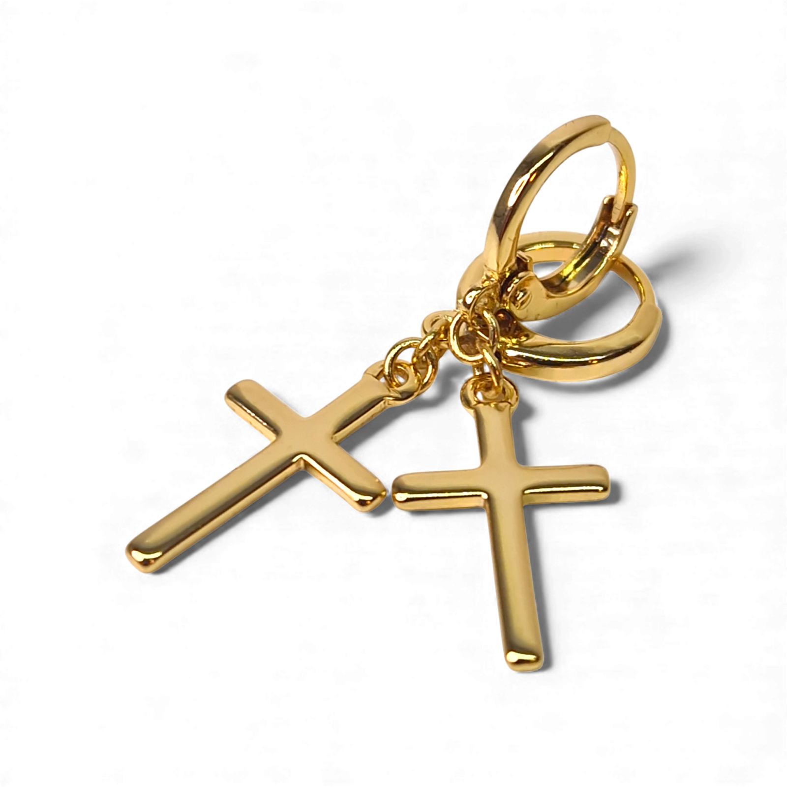 Fiecare cercel include o mică hoop aurie, fin lustruită, de care este suspendată o cruce cu linii drepte și aspect neted.