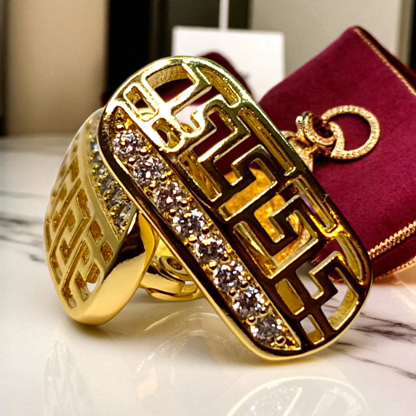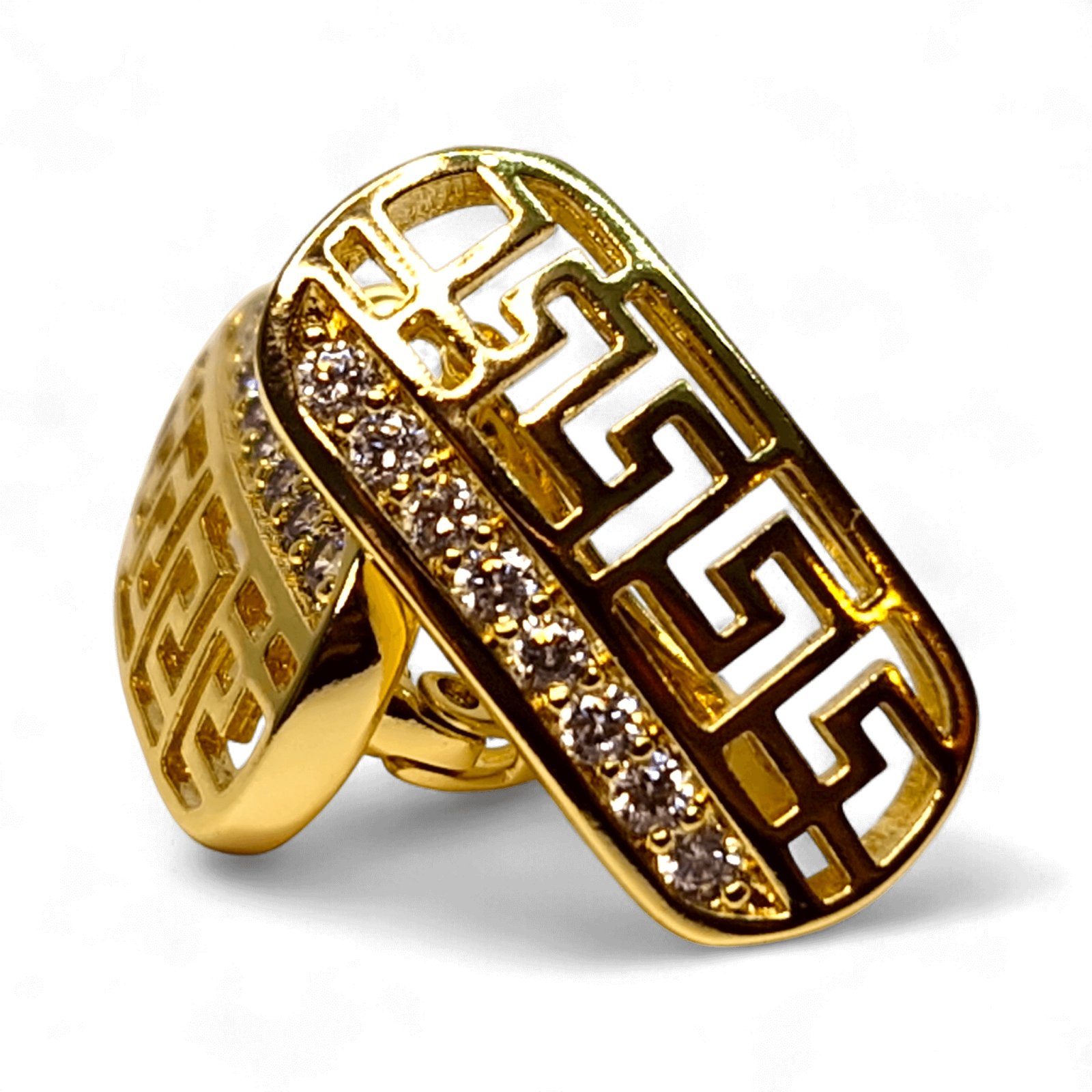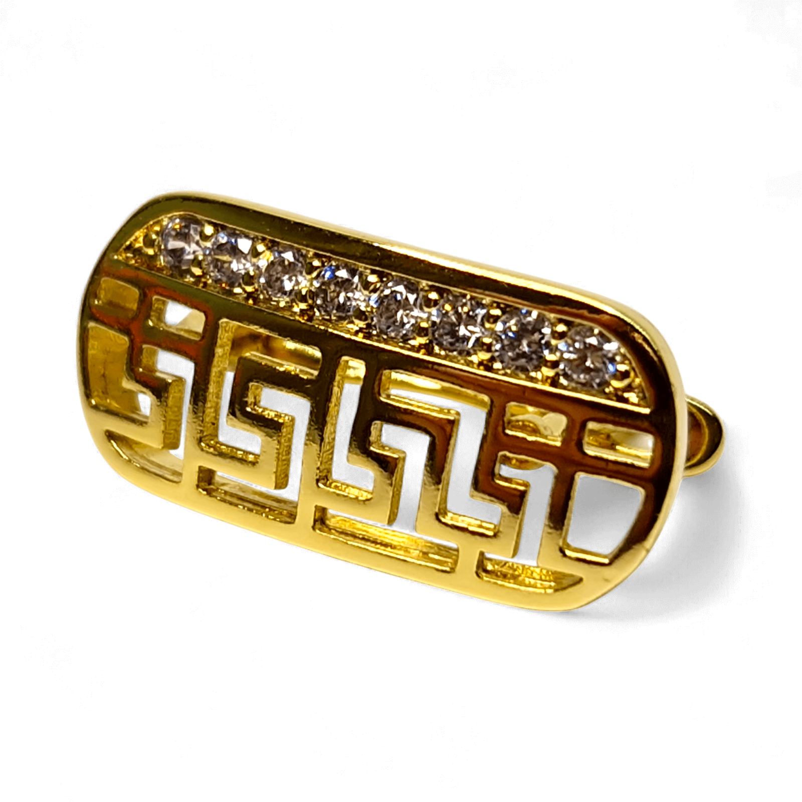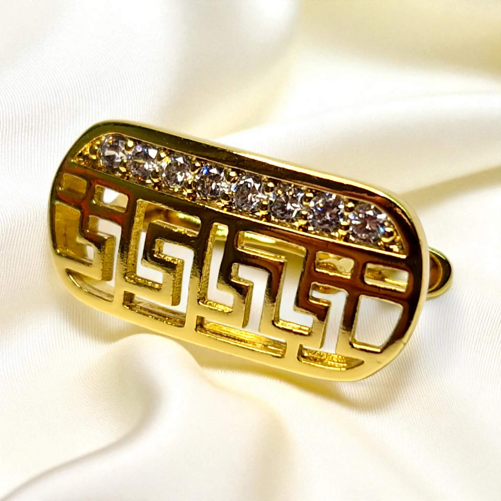 Partea superioară este acoperită cu zirconii mici, clare, montate dens pentru un efect luminos subtil, dar elegant.