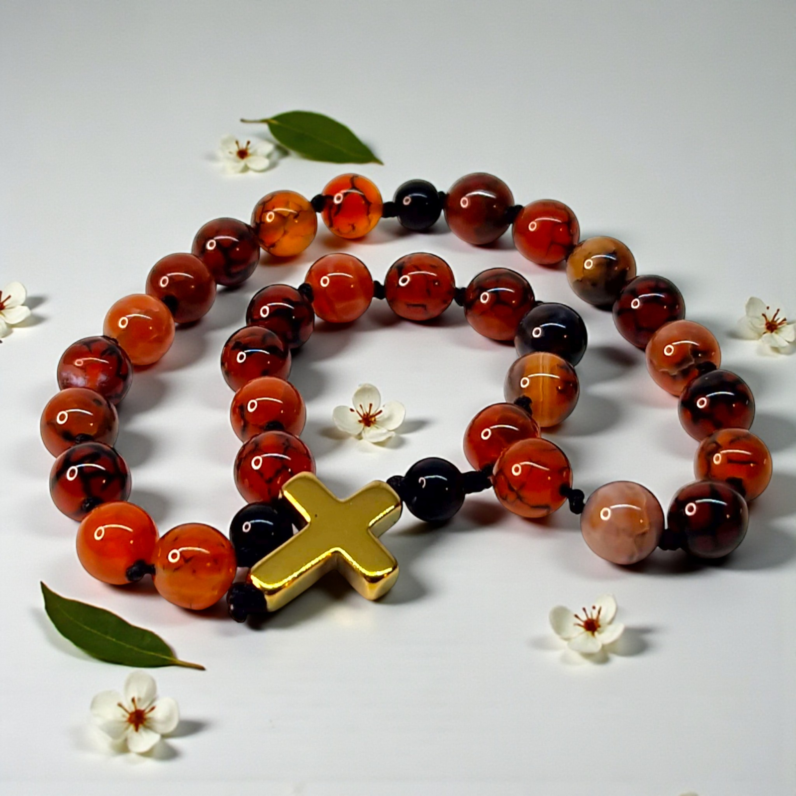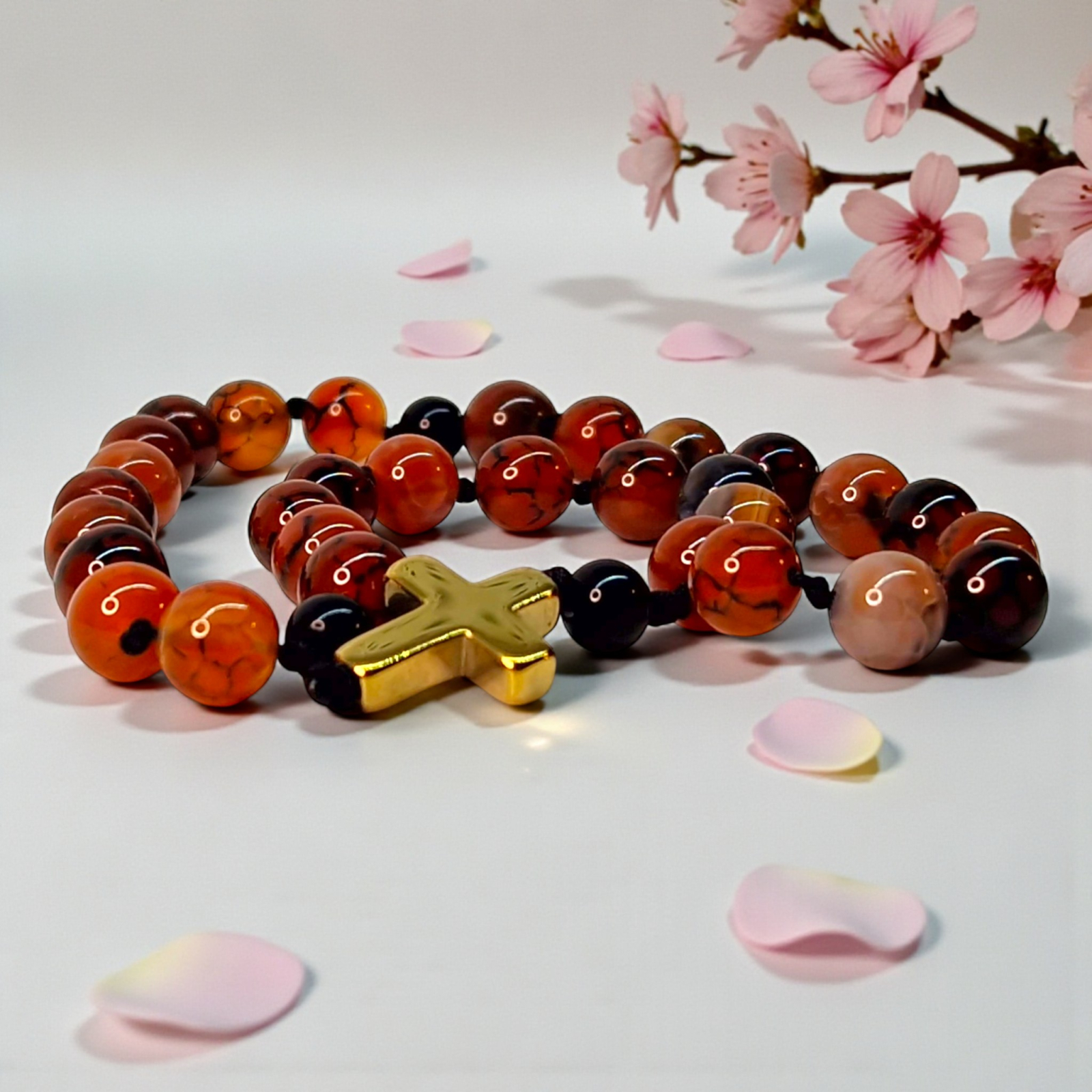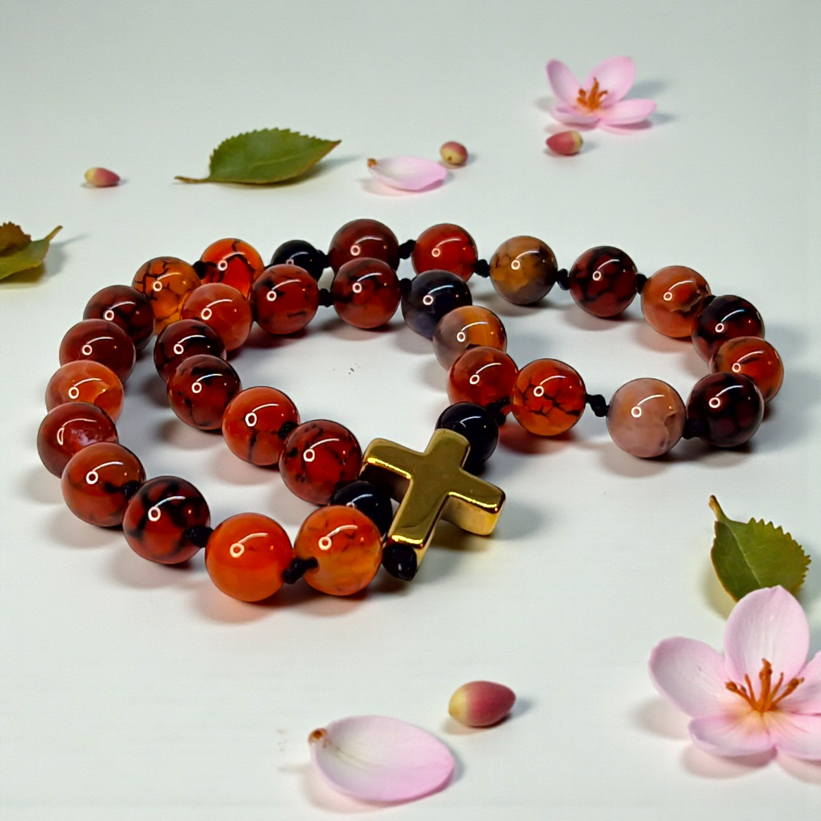 Metanierul IH803 combină forța pietrelor naturale cu simbolistica profundă a crucii din hematit aurit, oferind o bijuterie spirituală puternică și elegantă. Realizat din agate naturale în nuanțe calde de roșu și portocaliu, completate de hematit negru și o cruce aurie, acest metanier îmbină tradiția cu designul modern într‐un mod spectaculos.