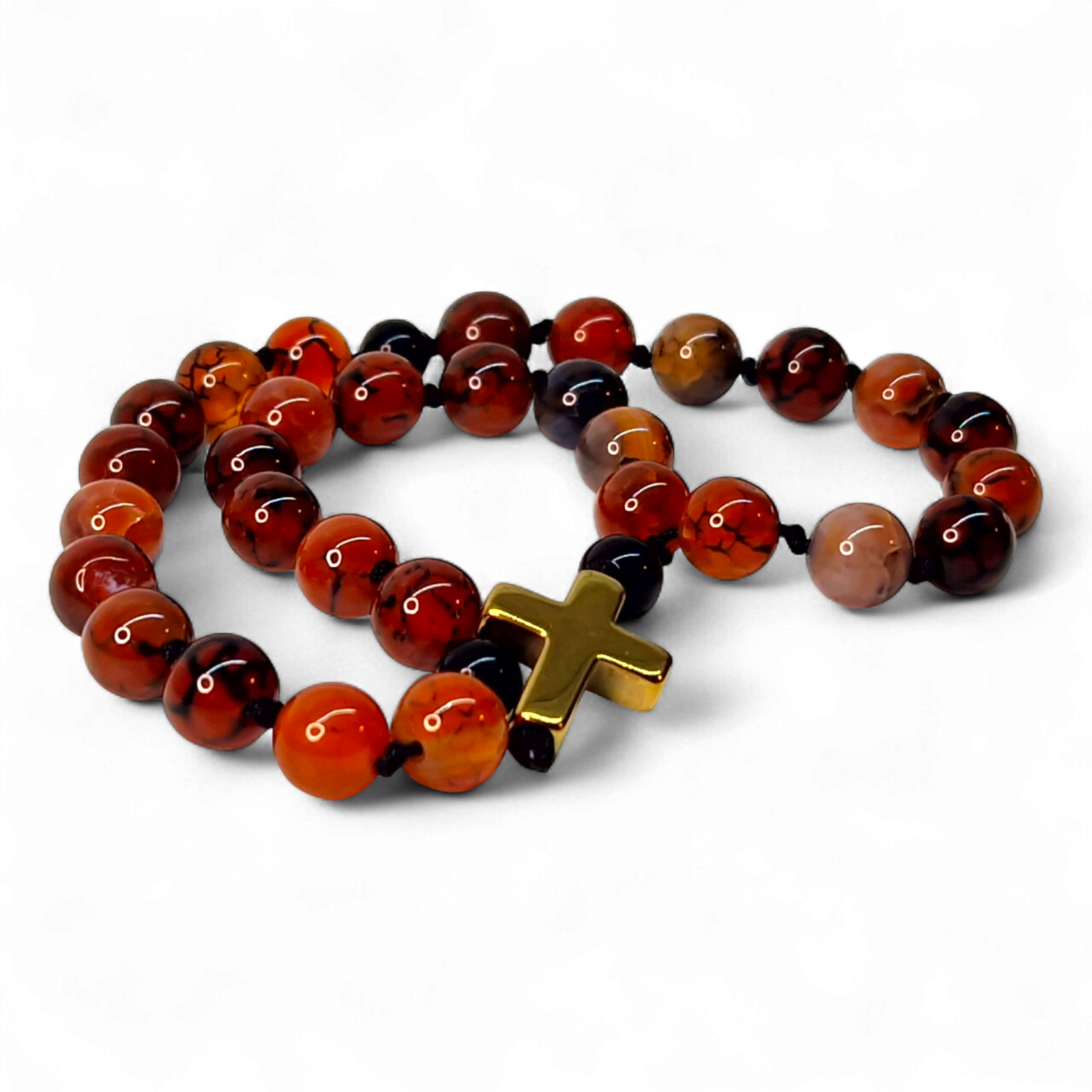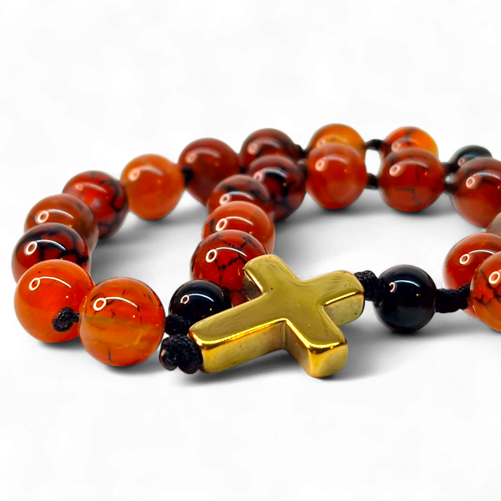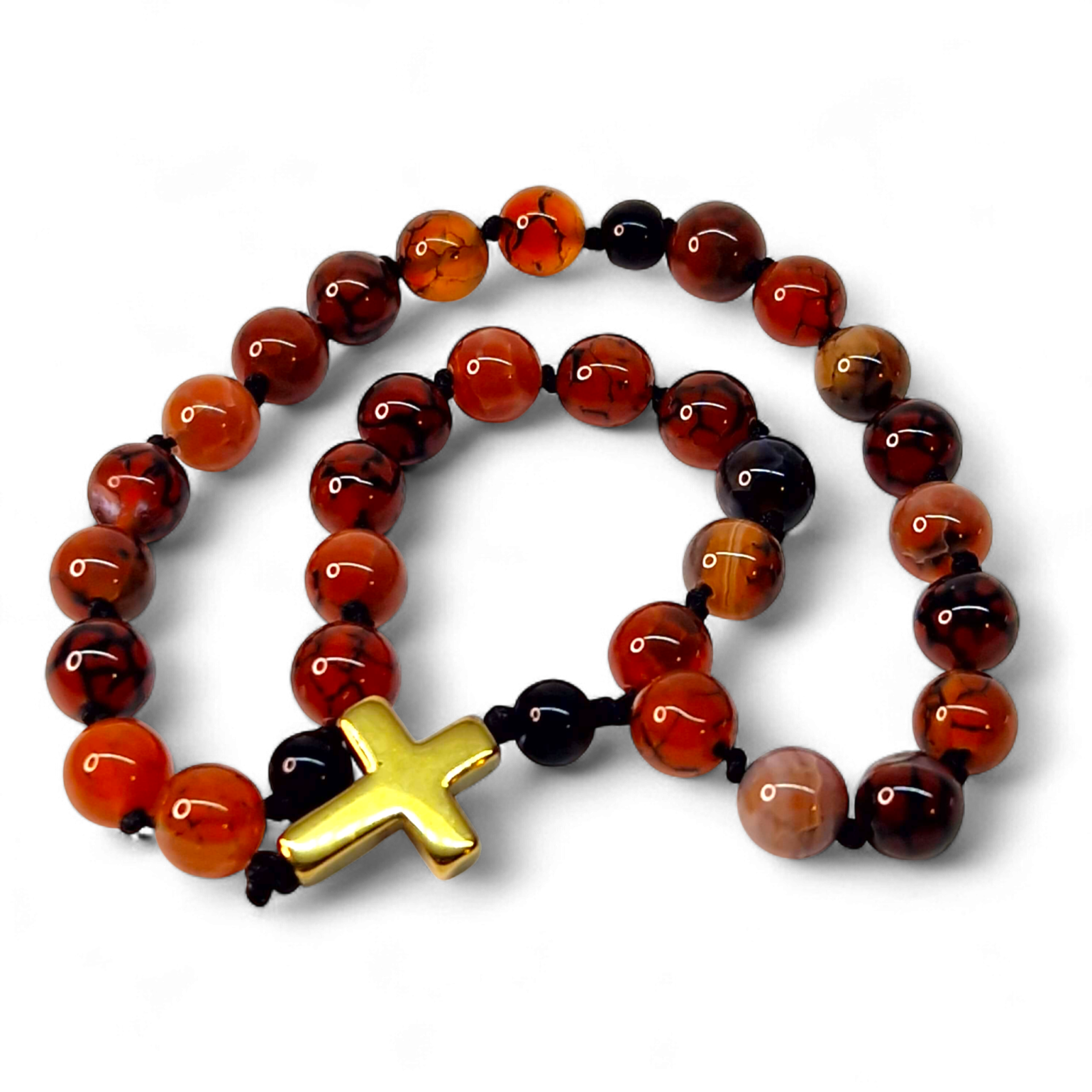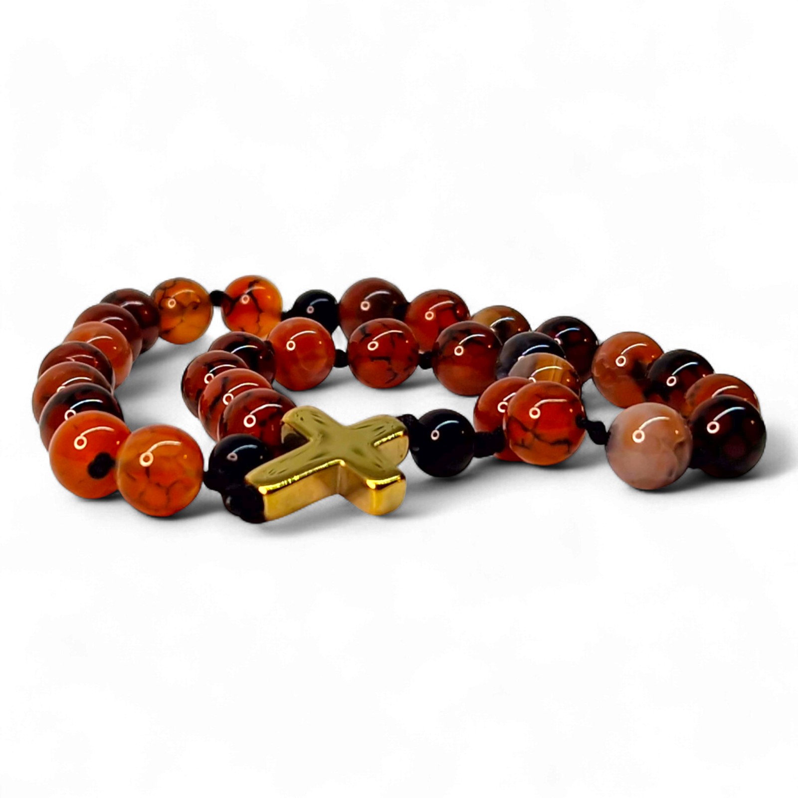 Metanierul IH803 combină forța pietrelor naturale cu simbolistica profundă a crucii din hematit aurit, oferind o bijuterie spirituală puternică și elegantă. Realizat din agate naturale în nuanțe calde de roșu și portocaliu, completate de hematit negru și o cruce aurie, acest metanier îmbină tradiția cu designul modern într‐un mod spectaculos.